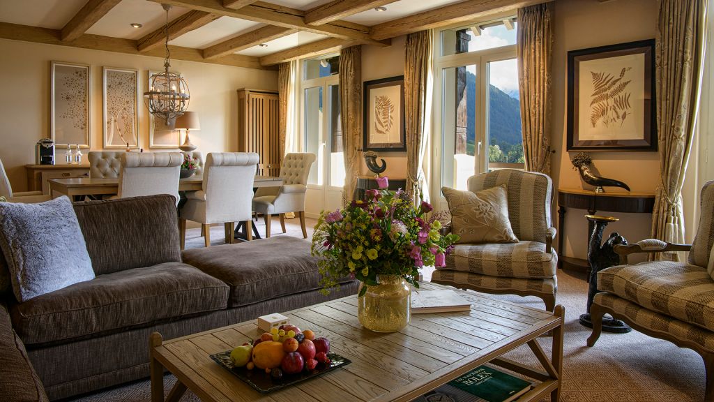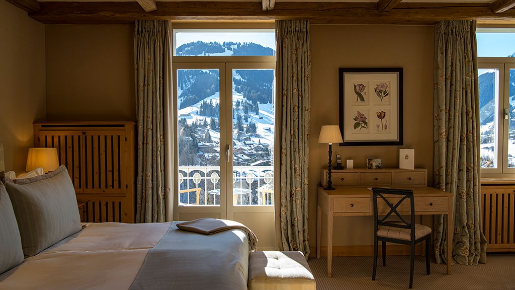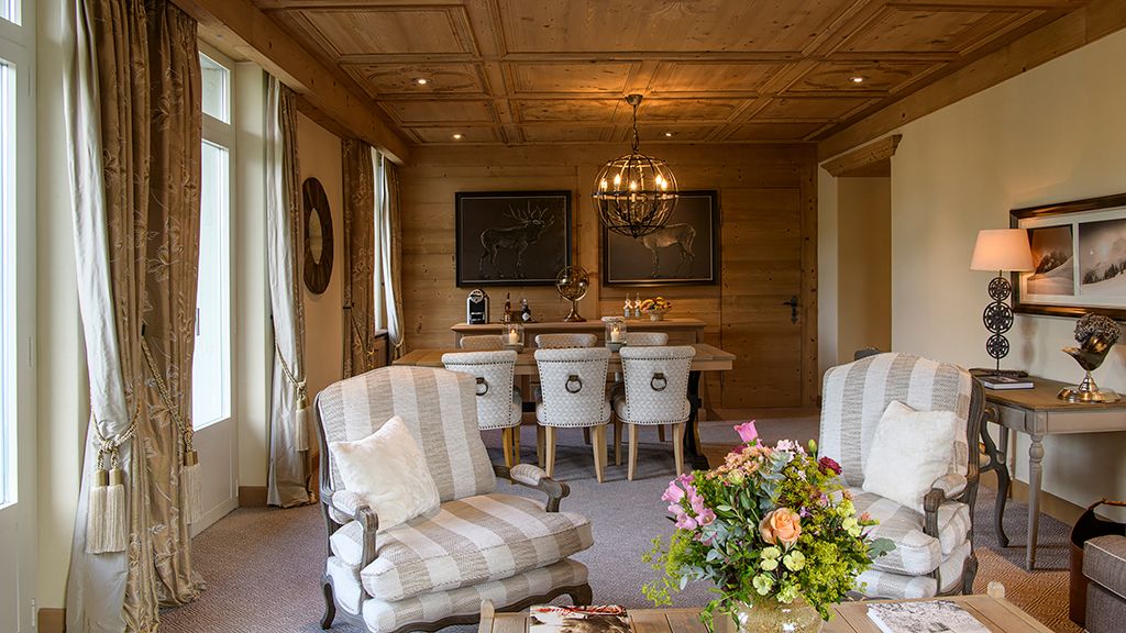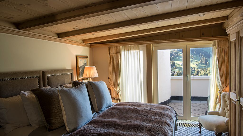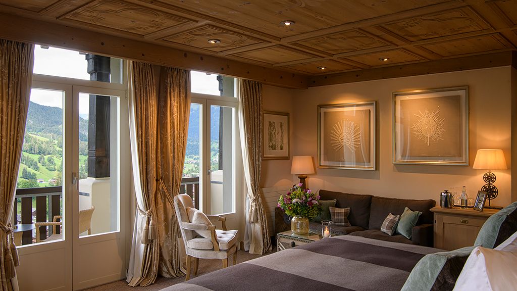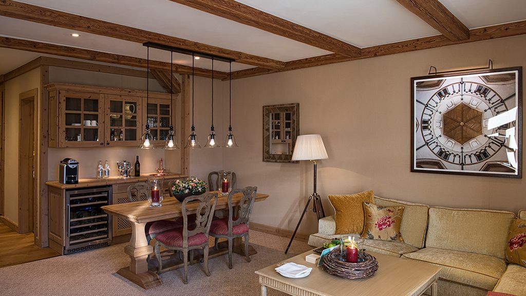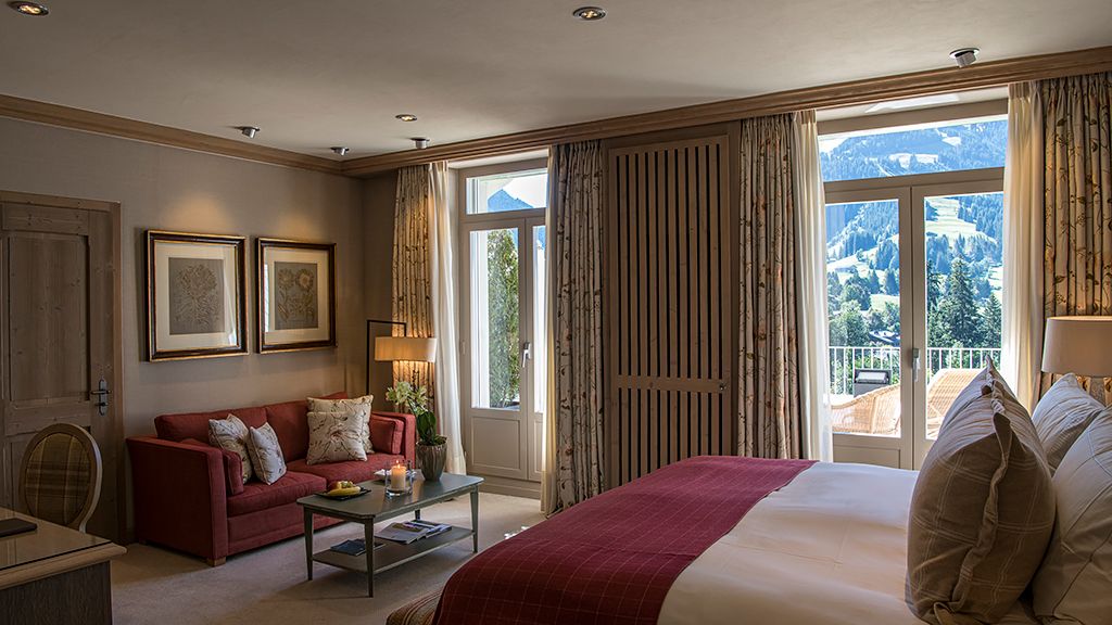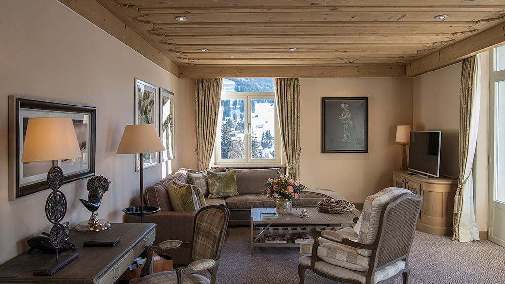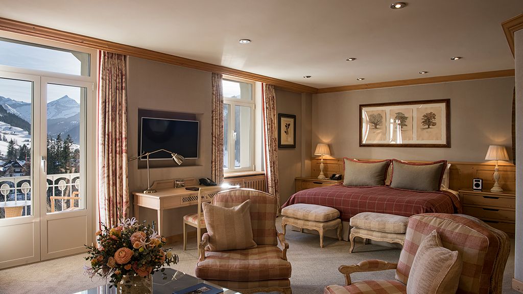 Corner suite mountain view 92 sqm. Of living space, one bedroom with bathroom and steam bath walk-in wardrobe large living room with a separate lounge and dining area balconies with breathtaking views over gstaad and the mountains the suite can be combined with a deluxe junior suite, which can again be enlarged with a classic room