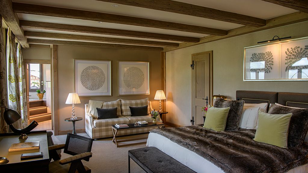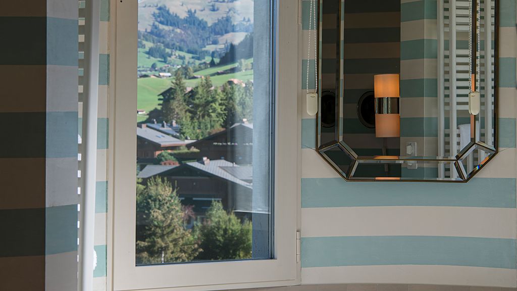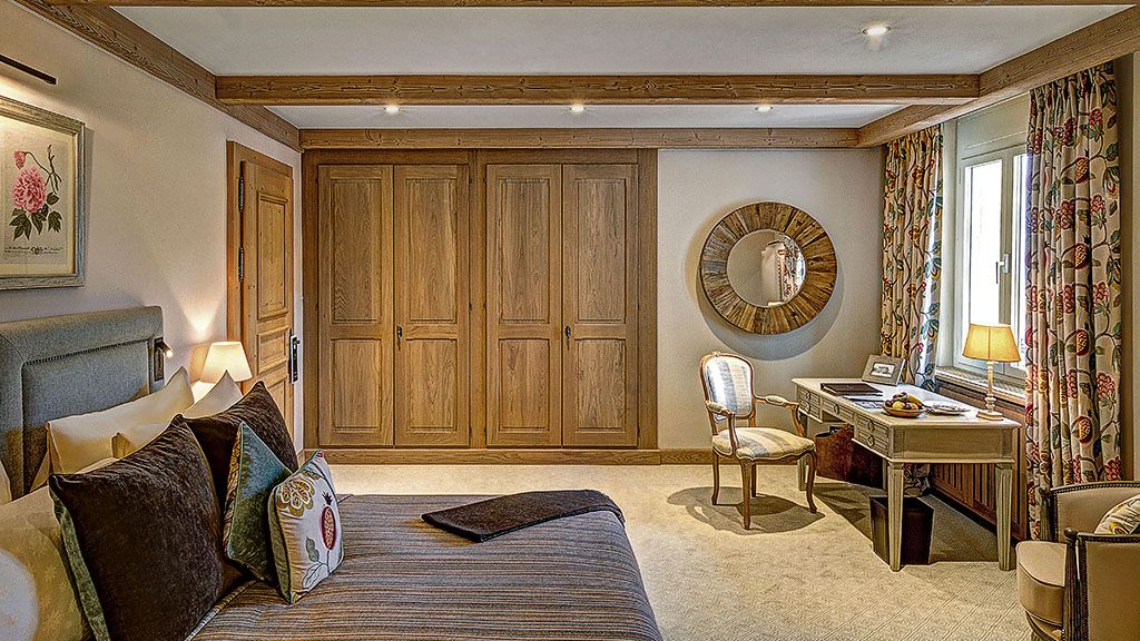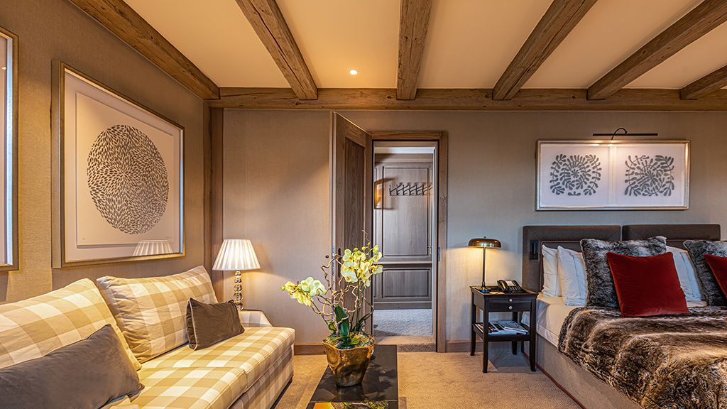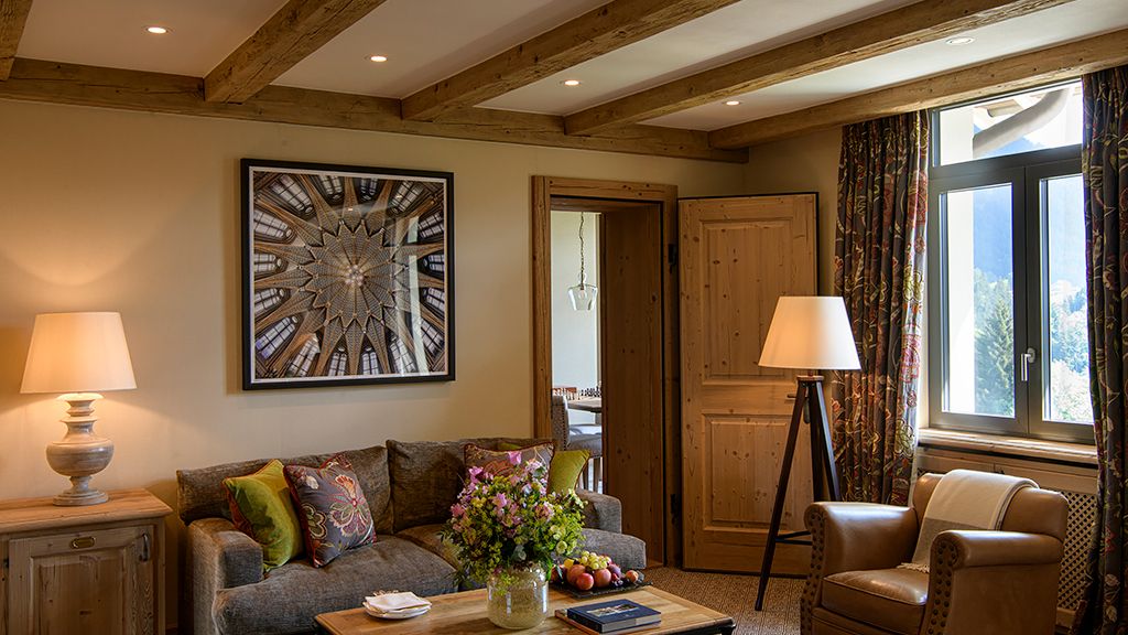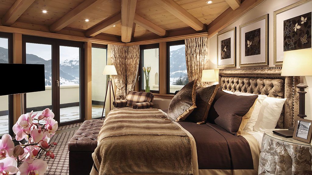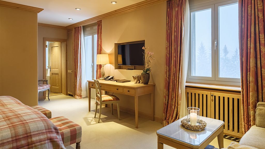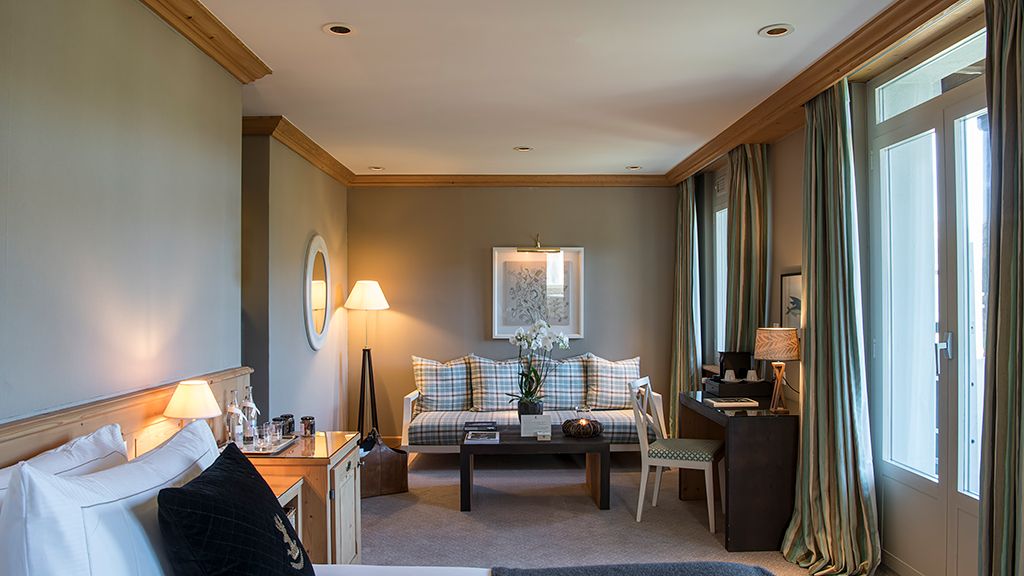 Tower junior suite mountain view from 43 sqm. Of living space, one bedroom with bathroom, bathtub in the tower walk-in wardrobe cosy lounge balcony with breathtaking views of the village and bernese mountains some suites can be combined with a tower two bedroom suite or a classic room