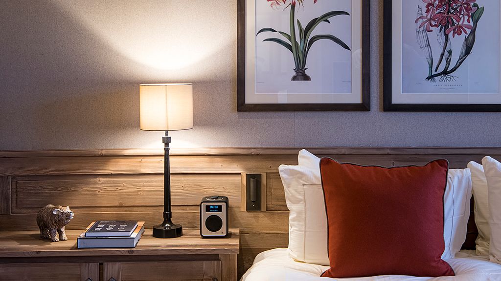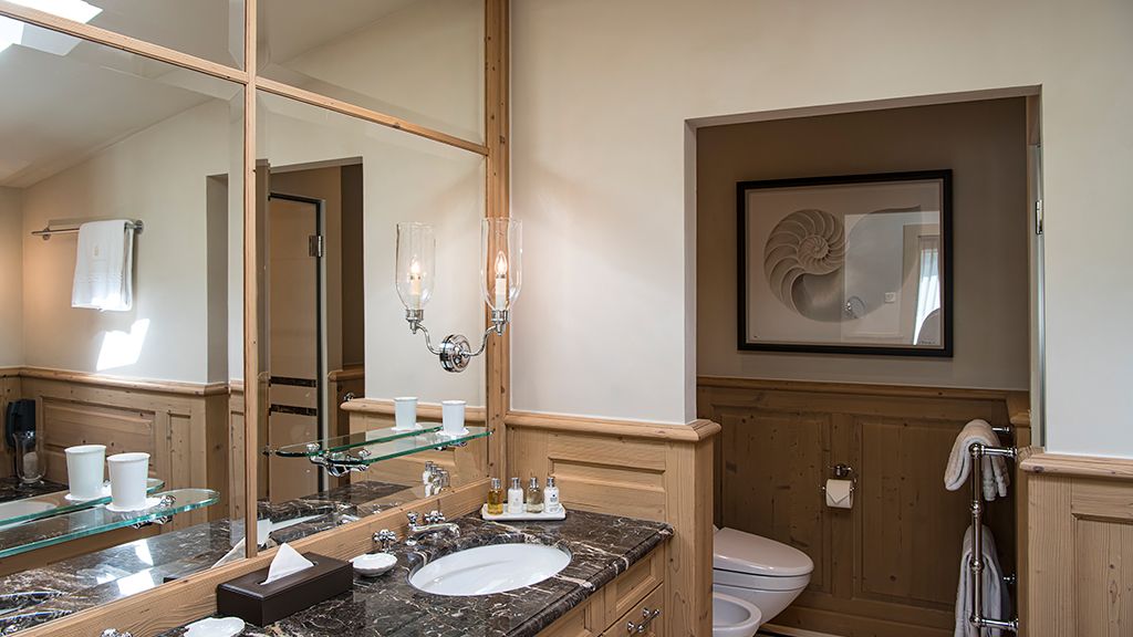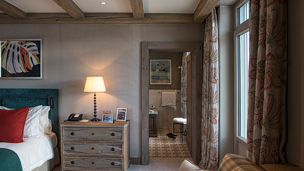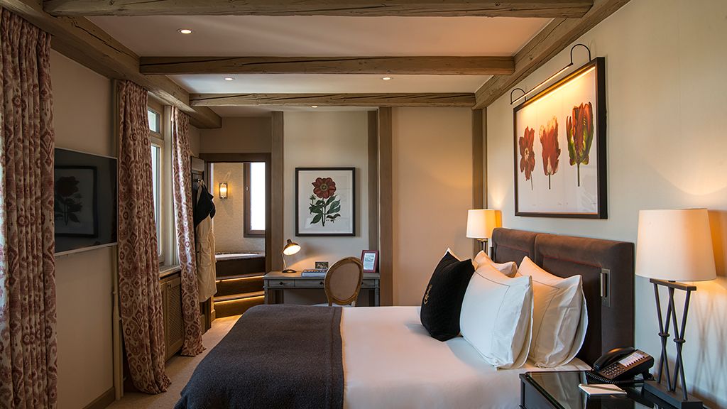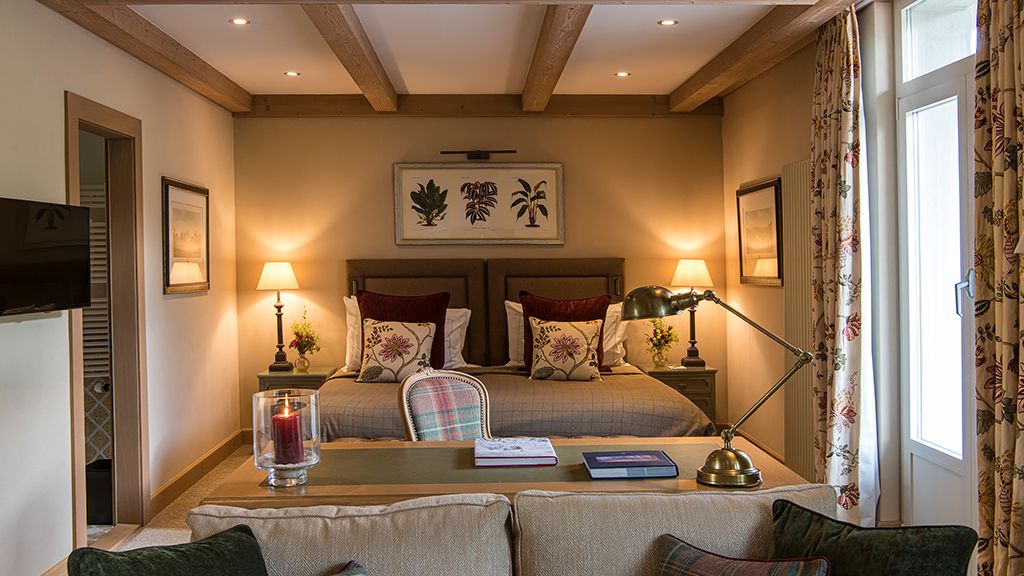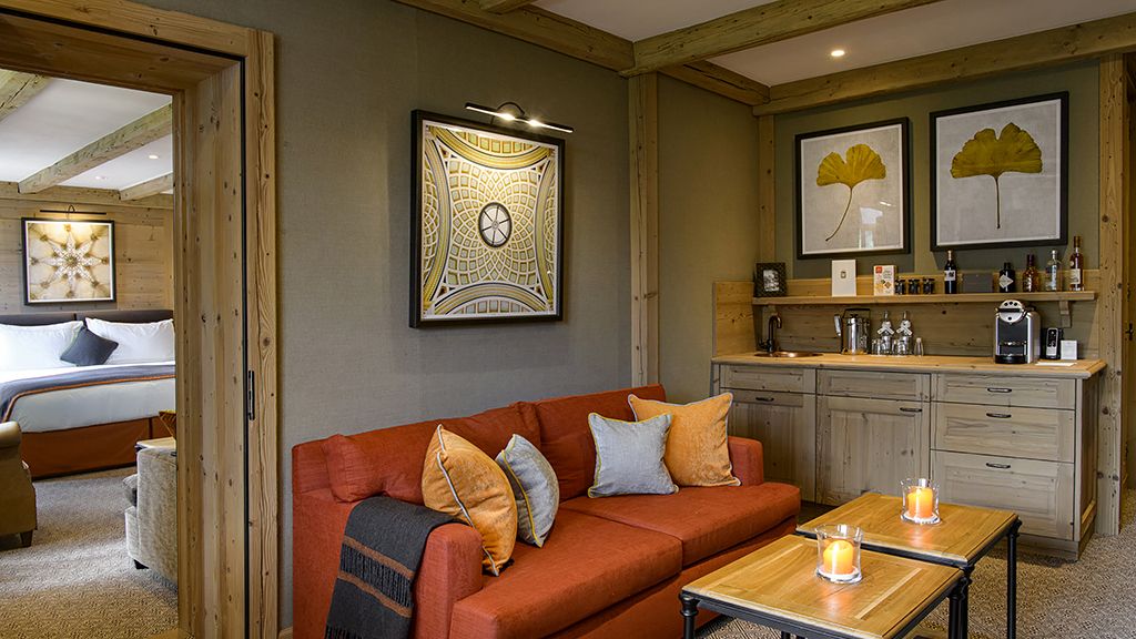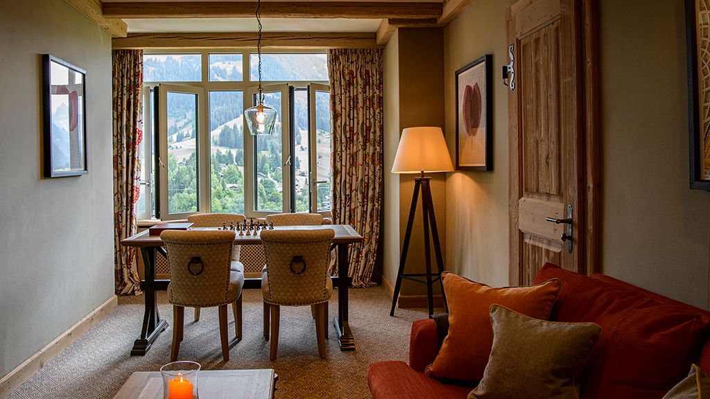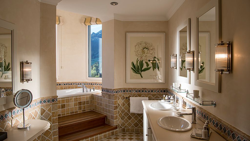 Tower junior suite mountain view from 43 sqm. Of living space, one bedroom with bathroom, bathtub in the tower walk-in wardrobe cosy lounge balcony with breathtaking views of the village and bernese mountains some suites can be combined with a tower two bedroom suite or a classic room