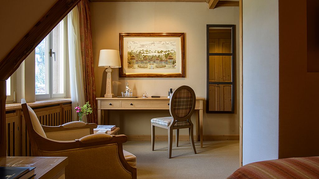 Classic room from 33 sqm. Of living space bathroom with bathtub writing corner views of the chalet landscape most rooms have a connecting door to a deluxe junior suite