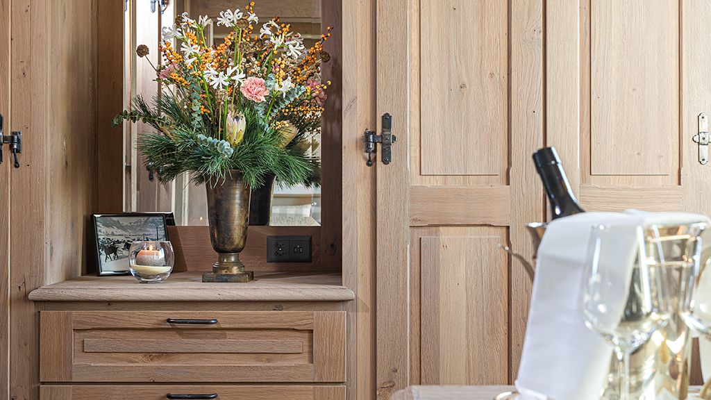 Tower two bedroom suite mountain view 190 sqm. Of living space, two bedrooms with a bathroom each, steam bath, bathtub in the tower walk-in wardrobes large living room with a dining area, spacious lounge and a guest bathroom with a shower writing desk with chess table in the tower balconies with views of the village and mountains the suite can be combined with a tower junior suite, which can again be enlarged with a classic room