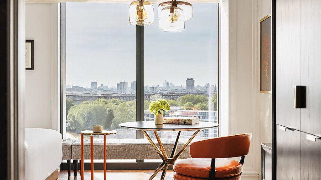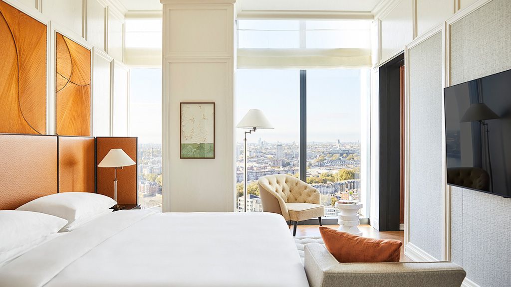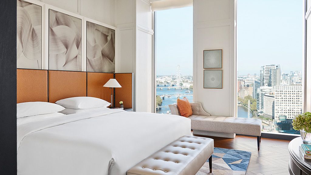 Overlooking London city through its floor to ceiling windows, this 35 sq m (376 sq ft) room boasts a plush king bed, featuring an elegant marble bathroom and fine amenities.