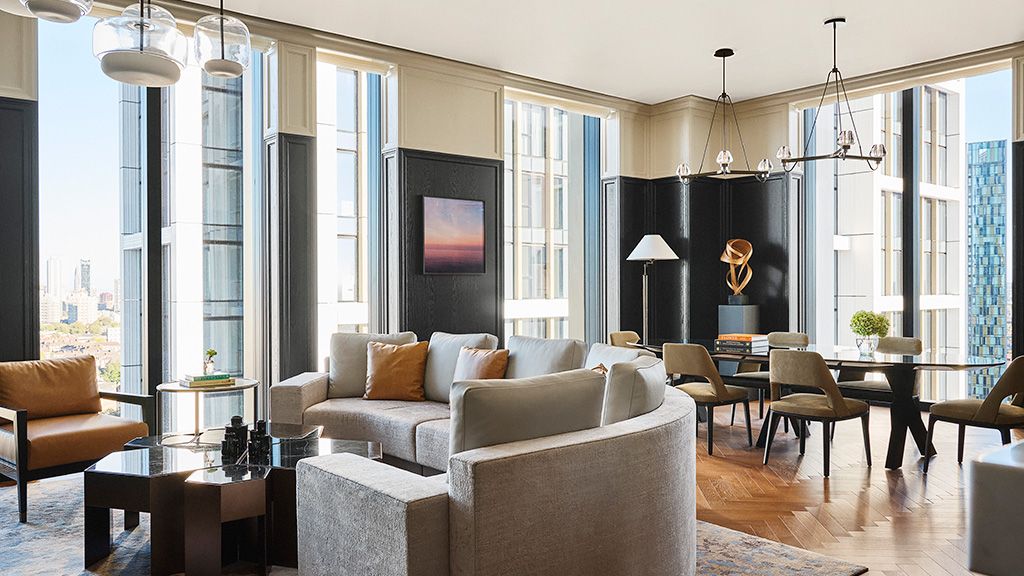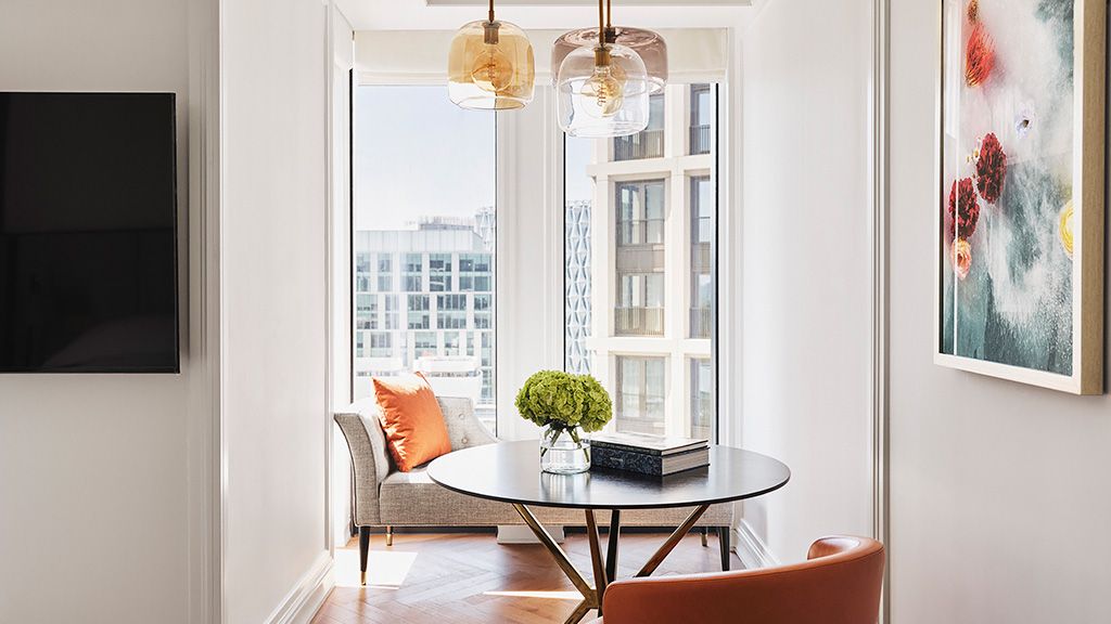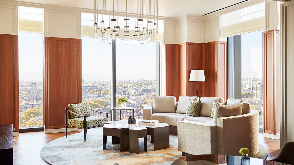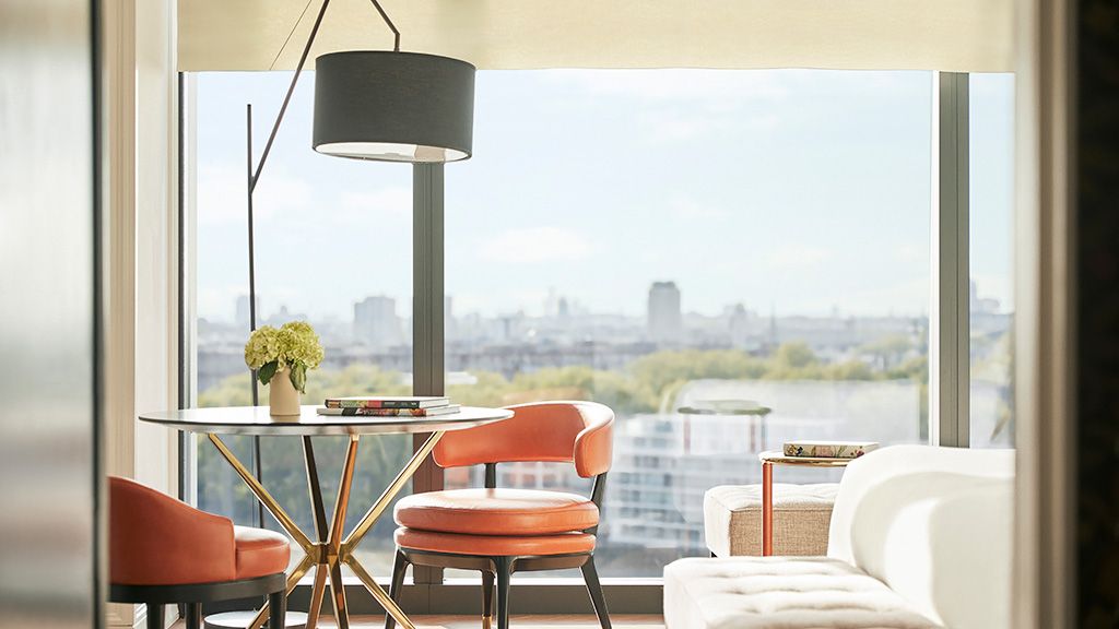 Experience the epitome of luxury in our beautifully appointed 113 sq m (1216 sq ft) Ambassador Suite decorated with modern art. Take the private elevator to the VIP floor, leading to this specialty suite featuring stunning London views, a king bedroom, a spacious living room, a kitchenette, a dining table for four, and a walk-in wardrobe. The freestanding bathtub in the marble bathroom offers panoramic views of the London skyline from floor-to-ceiling windows.