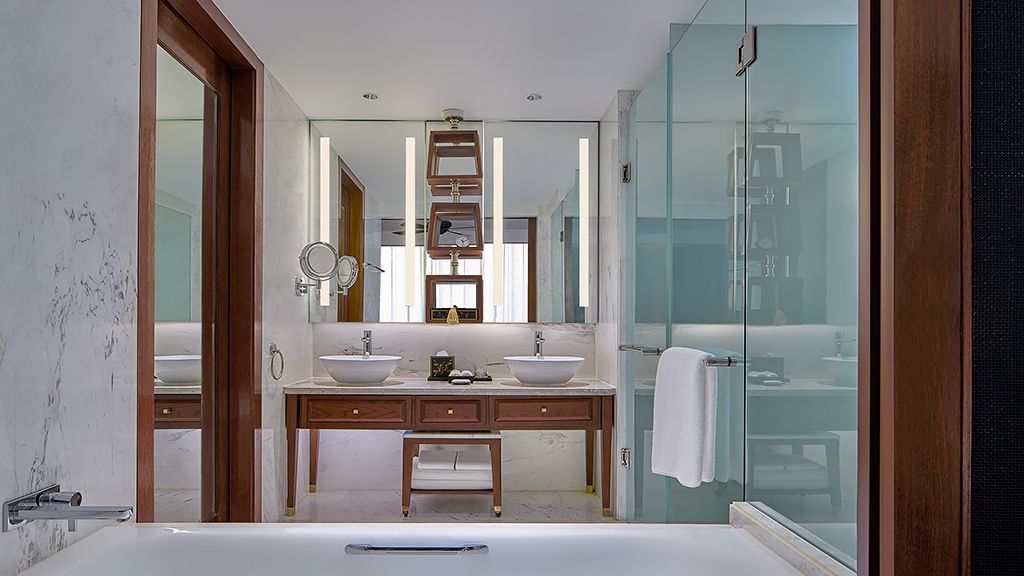 This sizable room at 35 sq m (376 sq ft) is adorned with bespoke art pieces and offers lovely views from its picturesque windows. It has a charming seating area, a plush king bed and a lavish semi-open marble bathroom.