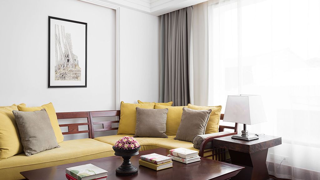 A luxurious Siem Reap hotel room to be discovered, the elegant first category suite of 71 sq m (764 sq ft) is an expansive suite with a cozy living area and a spacious bedroom with an en-suite marble bathroom.