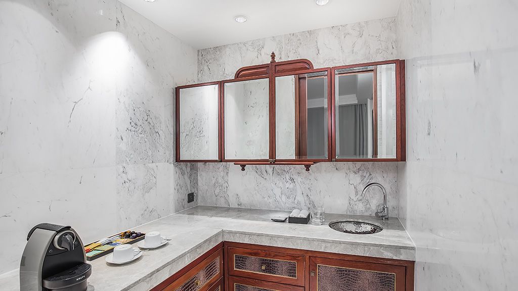 Unwind in 35 sq m (376 sq ft) of space in contemporary Khmer art décor. Pamper yourself in an elegant bathroom in Italian white marble