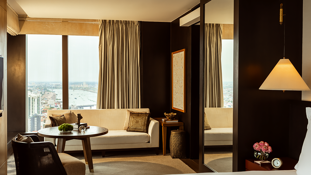 With an average 95 square meters (1, 022 square feet) of living space, with picturesque views of the mekong river. The exclusive chaktomuk suites offer guests a spacious entrance foyer, separate living room and bedroom, dining area, custom fabrics and linen and contemporary artwork adorning the walls. -ultra luxury -unparalleled city views - a sense of place -lifestyle layouts -comfortable yet sophisticated -modern technology -timeless furnishings -complimentary wi-fi -in room safe -in room coffee