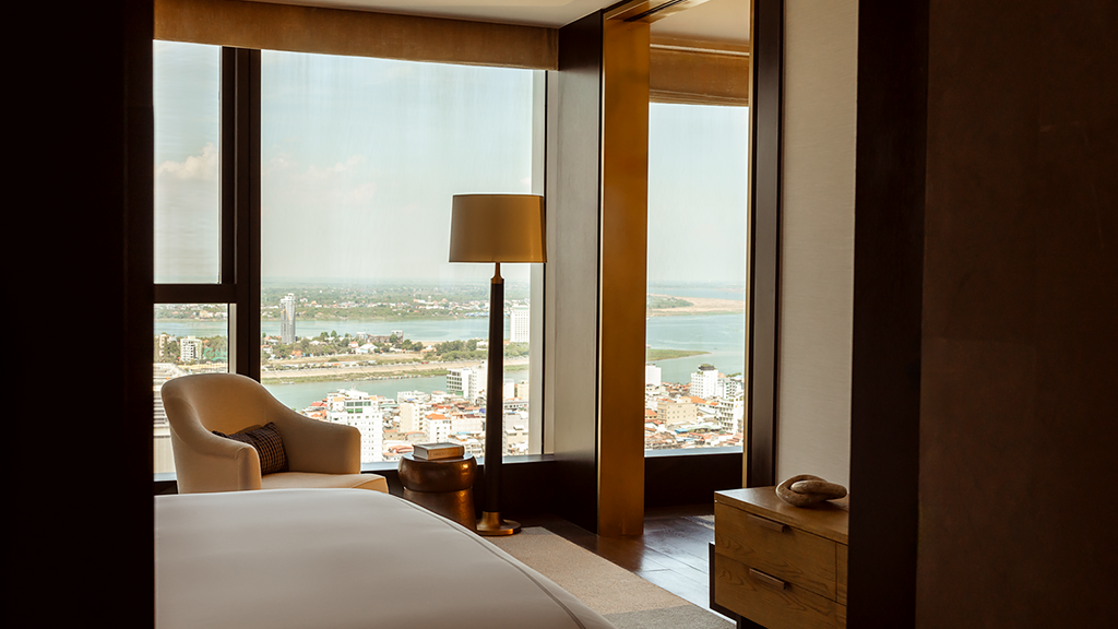 Spacious one-bedroom corner suite with panoramic views of Phnom Penh and the Mekong River, featuring a separate living room, private bathtub, and refined residential comfort.