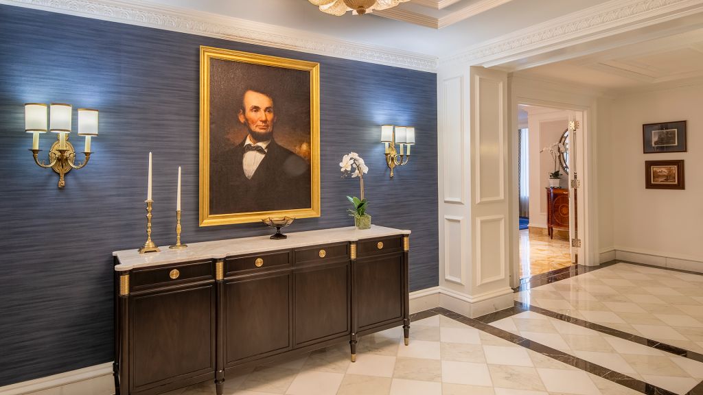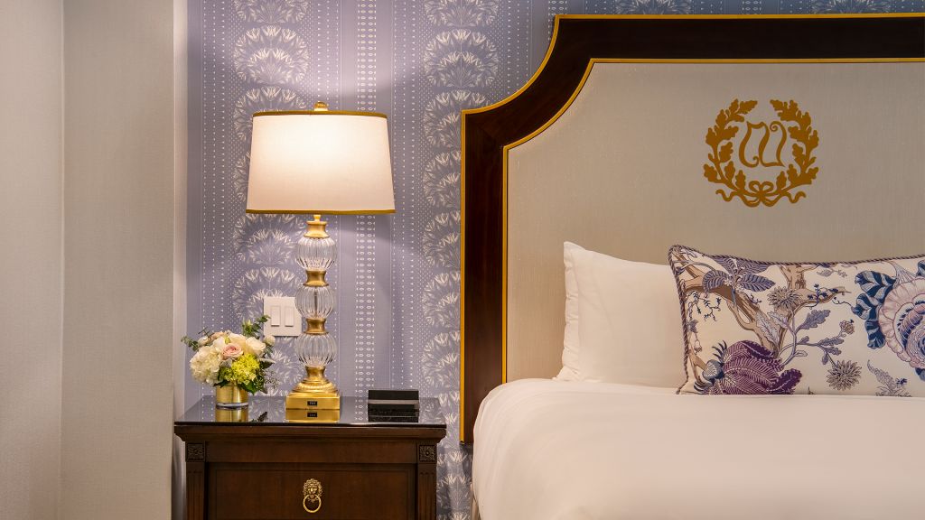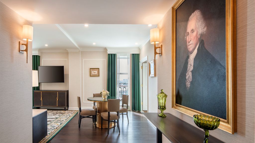 Named in honor of the 16th president of the United States, the Abraham Lincoln Suite is 1425 ft2/ 132 m2 and features a living room with a sitting area for five, a federalist-style dining table that can accommodate eight, as well as an adjoining butler pantry with mini-fridge. Overlooking the hotel’s courtyard, this relatively quiet interior room also includes a spacious bedroom with a sitting area with a couch, armchair and coffee table, a bathroom with a walk-in shower, and a separate entrance for extra privacy.